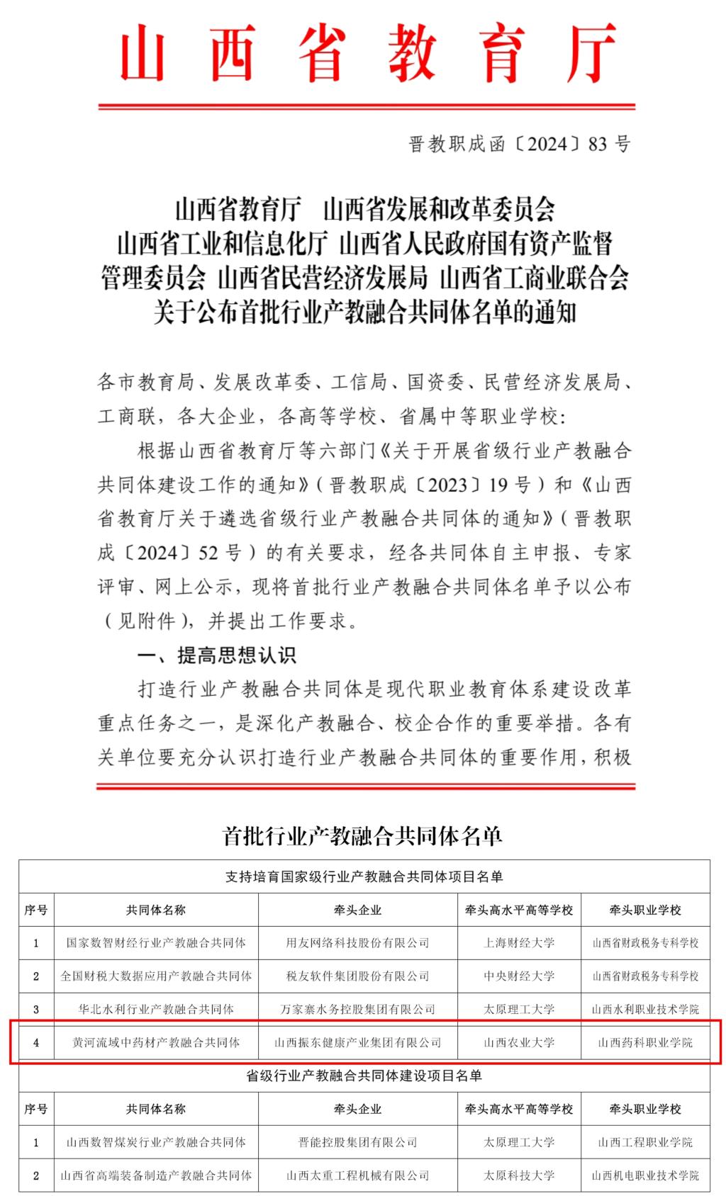 近日,山西省教育厅等六家单位联合发文,公布了全省首批行业产教融合共同体名单,黄河流域中药材产教融合共同体被确定为“培育国家级行业产教融合共同体”。该共同体由sunbet申搏联合山西农业大学、山西振东健康产业集团有限公司共同牵头成立,涵盖黄河流域9省域的地方政府、行...2025-01-02