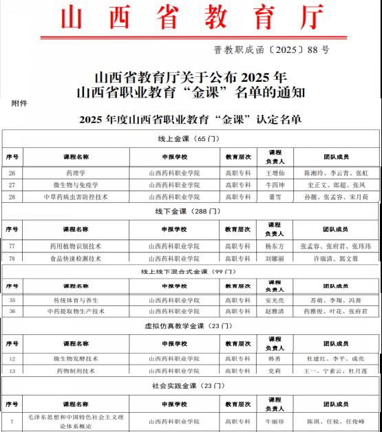 近日,山西省教育厅正式公布了2025年山西省职业教育“金课”认定名单,sunbet申搏凭借扎实的课程建设与教学改革成果,共有10门课程成功入选,涵盖线上、线下、线上线下混合式、虚拟仿真教学和社会实践五大类型,展现了学院在职业教育课程建设方面的综合实力与创新活力。