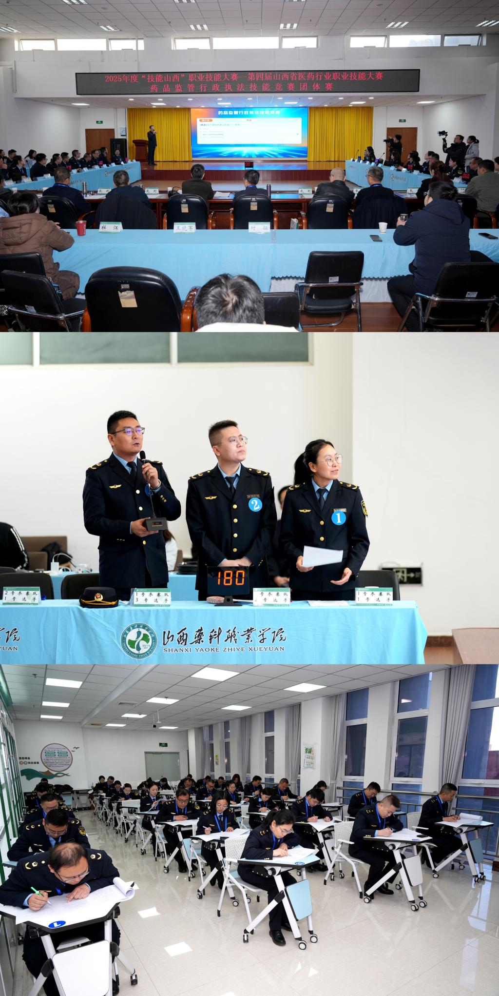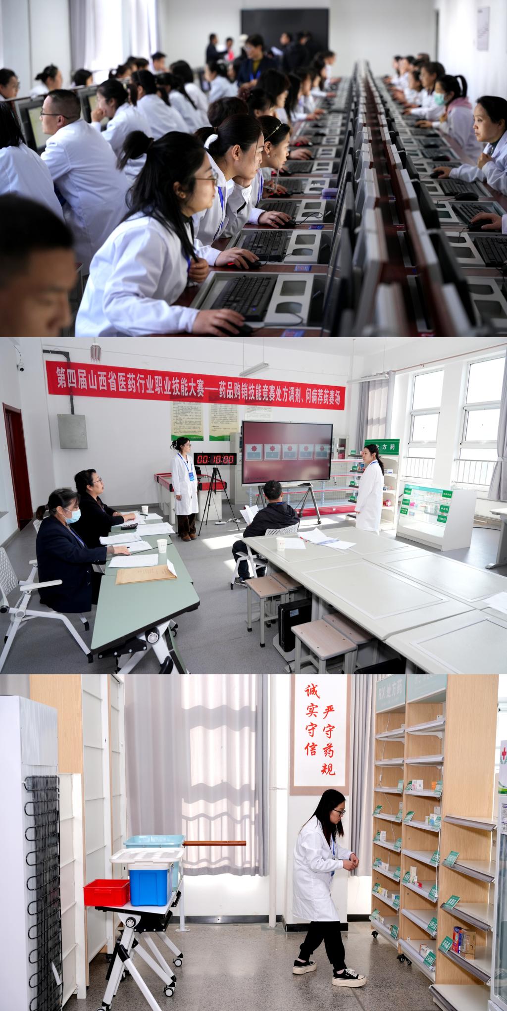 比赛现场气氛紧张而有序。在药品购销赛区,选手们熟练完成药品分类陈列、处方审核与调配,并在模拟药学服务场景中准确开展用药指导与慢病管理咨询。药品监管执法赛区则模拟真实执法情境,选手们迅速进行证据采集、法律条文引用和执法文书撰写,展现出扎实的法律功底与应急处理能力。裁判团队全程跟踪评分,确保竞赛公平、专业。