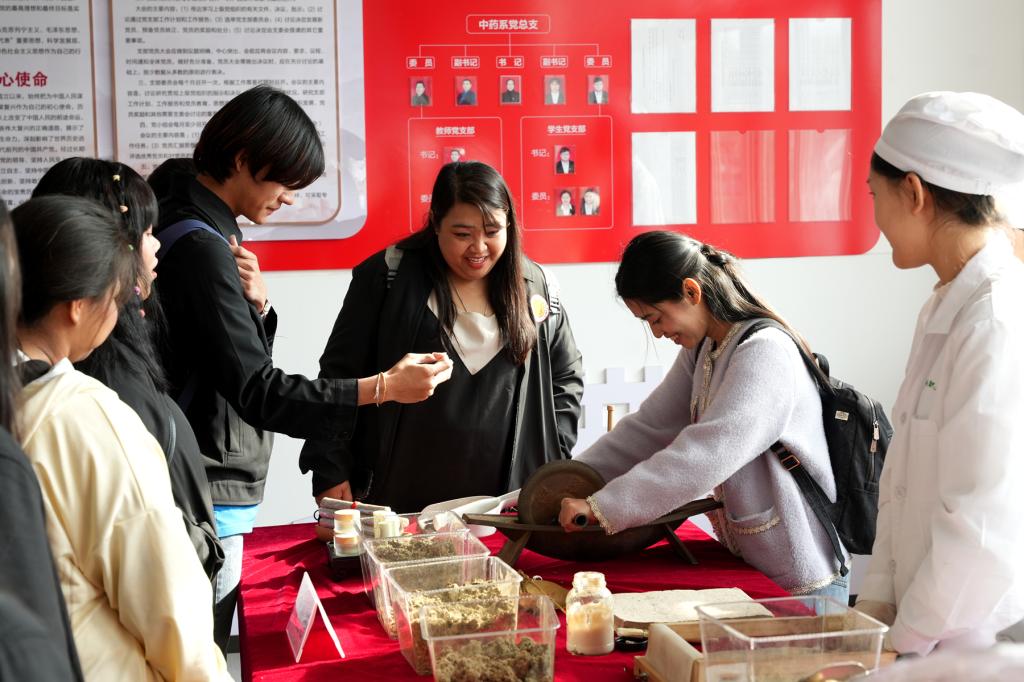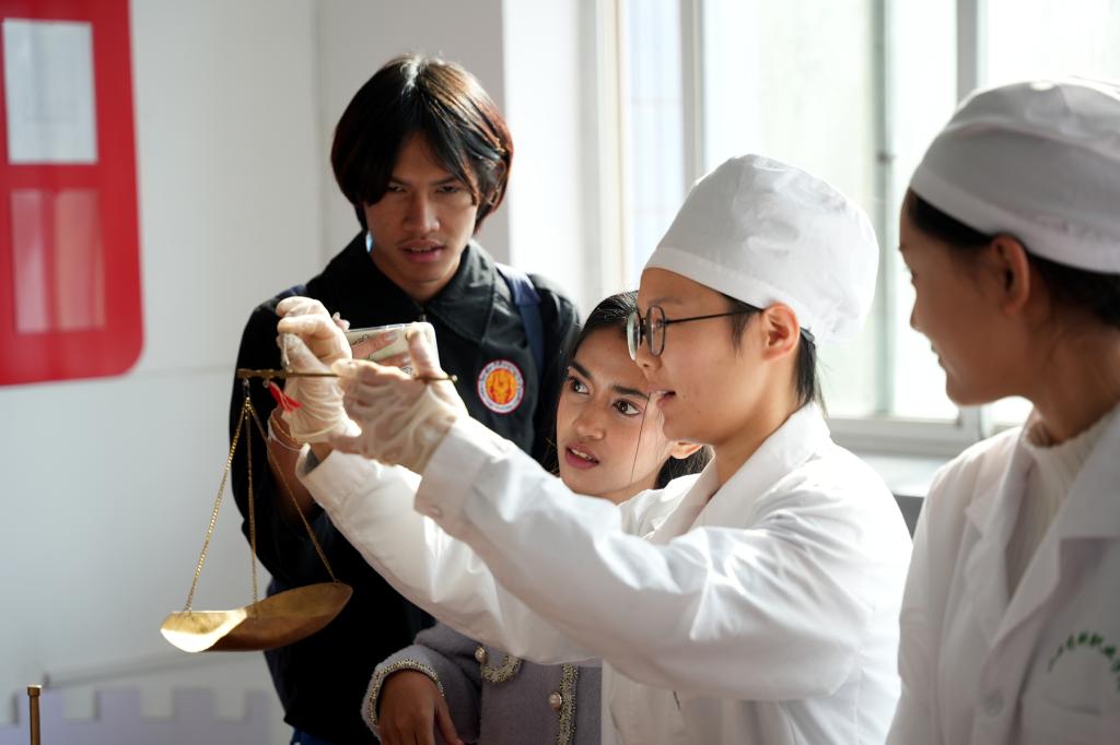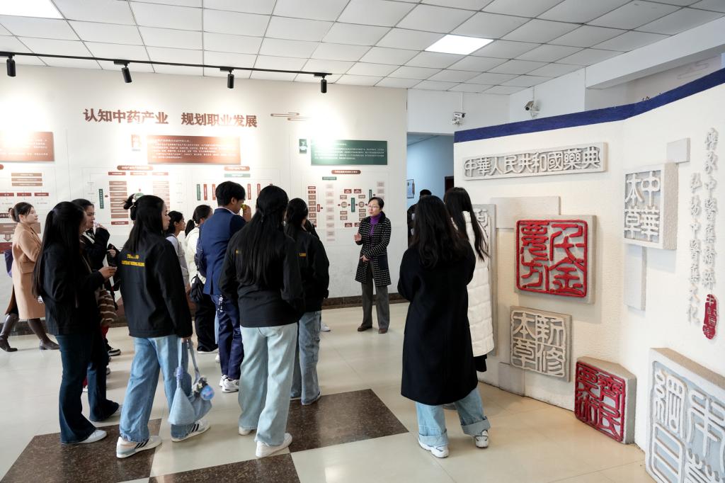 泰国师生实地参观了中药标本厅、中药调剂技艺传承基地、百草大药房、药・茶技能技艺传承与创新实训基地以及传统文化教育学习室等一系列极具中华文化底蕴的育人场所,sunbet申搏讲解员为其详细介绍了中医药文化的丰富内容和深厚内涵,使其对我国中药传统文化、中医传统调剂技艺以及传统茶文化有了更为直观和深刻的理解。