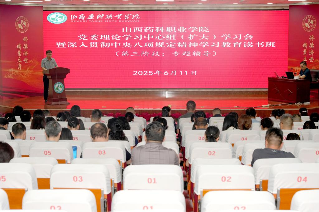 7月1日,党委书记张轩萍以《深入贯彻中央八项规定精神 以优良作风护航全国一流药科职业院校建设》为题,为学院全体党员干部讲授专题党课。党委副书记沈宝荣主持党课学习。张轩萍与大家一同学习领会了习近平总书记关于加强党的作风建设的重要论述,强调要提高站位、深化认...2025-07-01 -